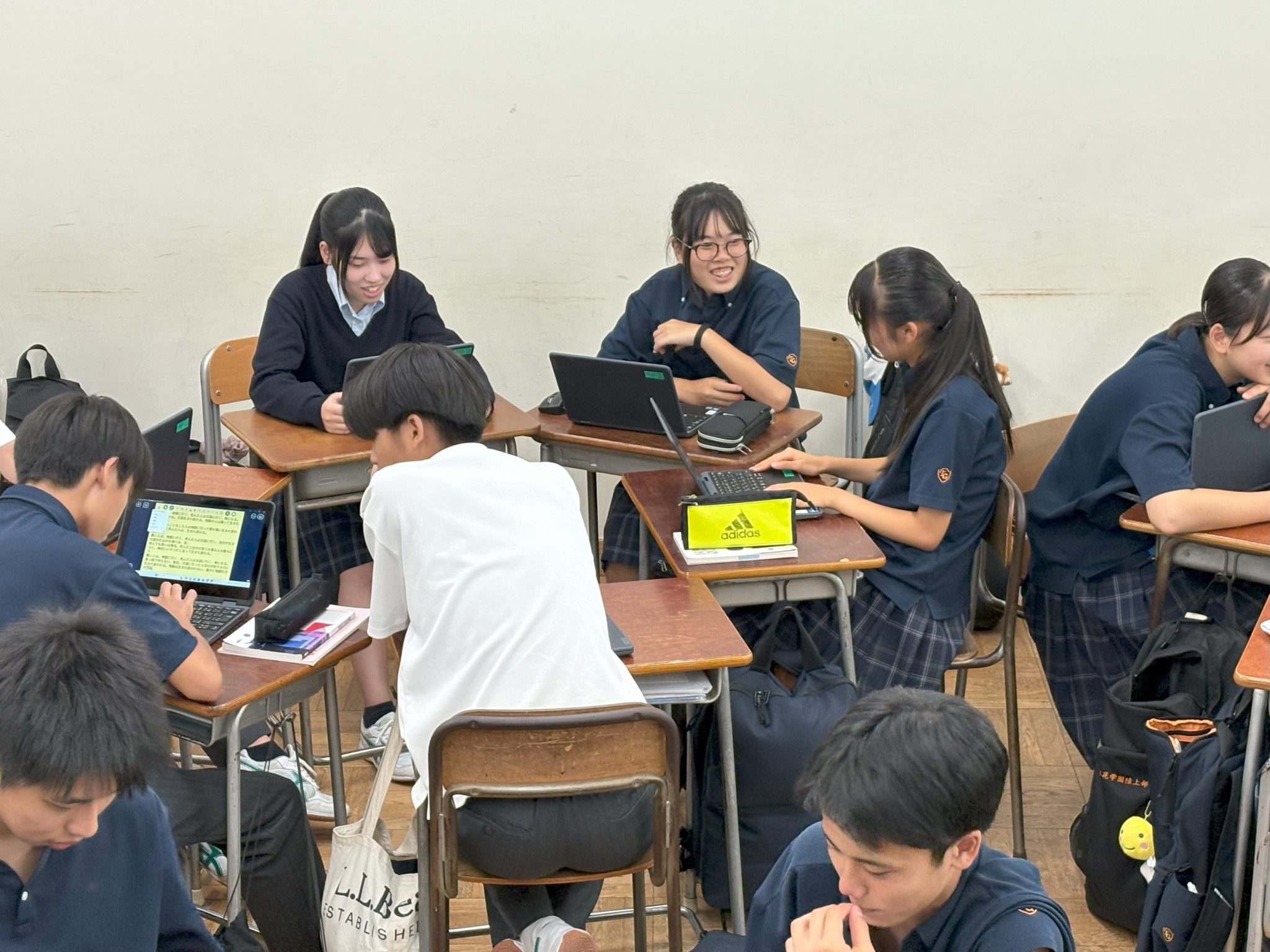 高校1年生の国語の授業では、この「ワールド・カフェ」の7つの原理に基づいた対話型活動を行いました。生徒たちは5〜6人のグループに分かれ、各グループにホストを決めて、イエス・ノーでは答えられないテーマについて自由に会話を楽しみました。