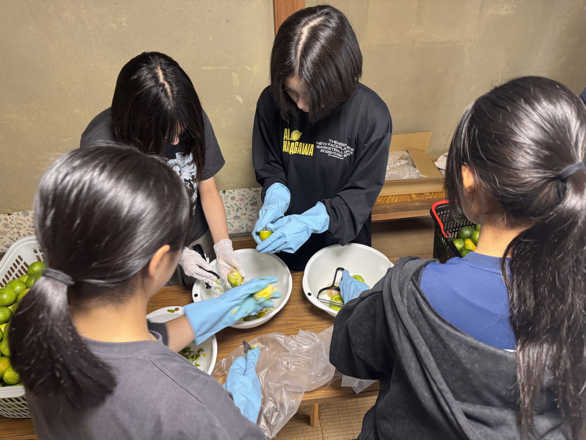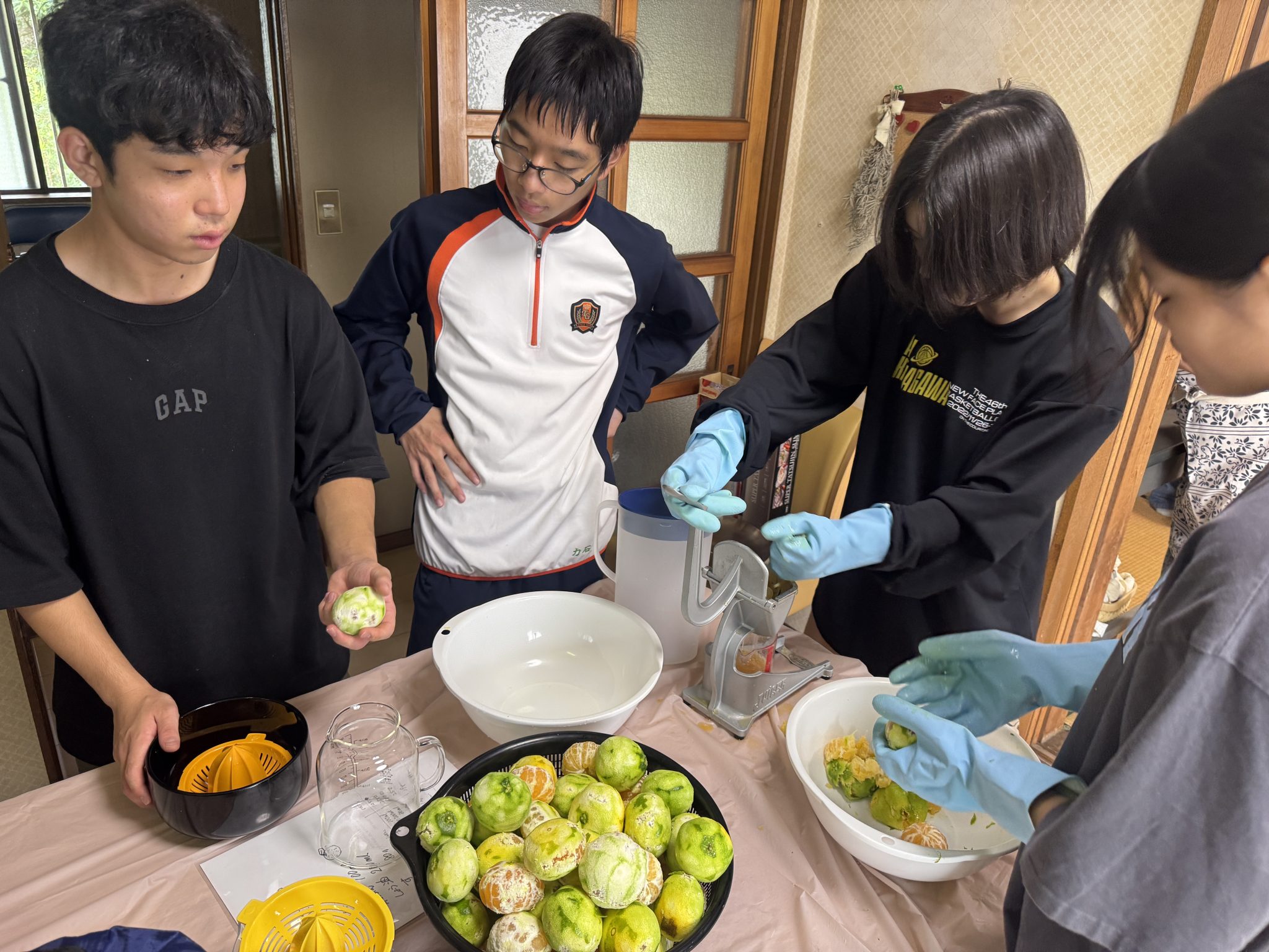 一緒にポン酢のづくりをしながら、皮むきをしたり、みかん果汁を試飲したりするうちに、東海大学附属高輪台高校の生徒とも楽しそうに会話をしながら交流を深めていました。