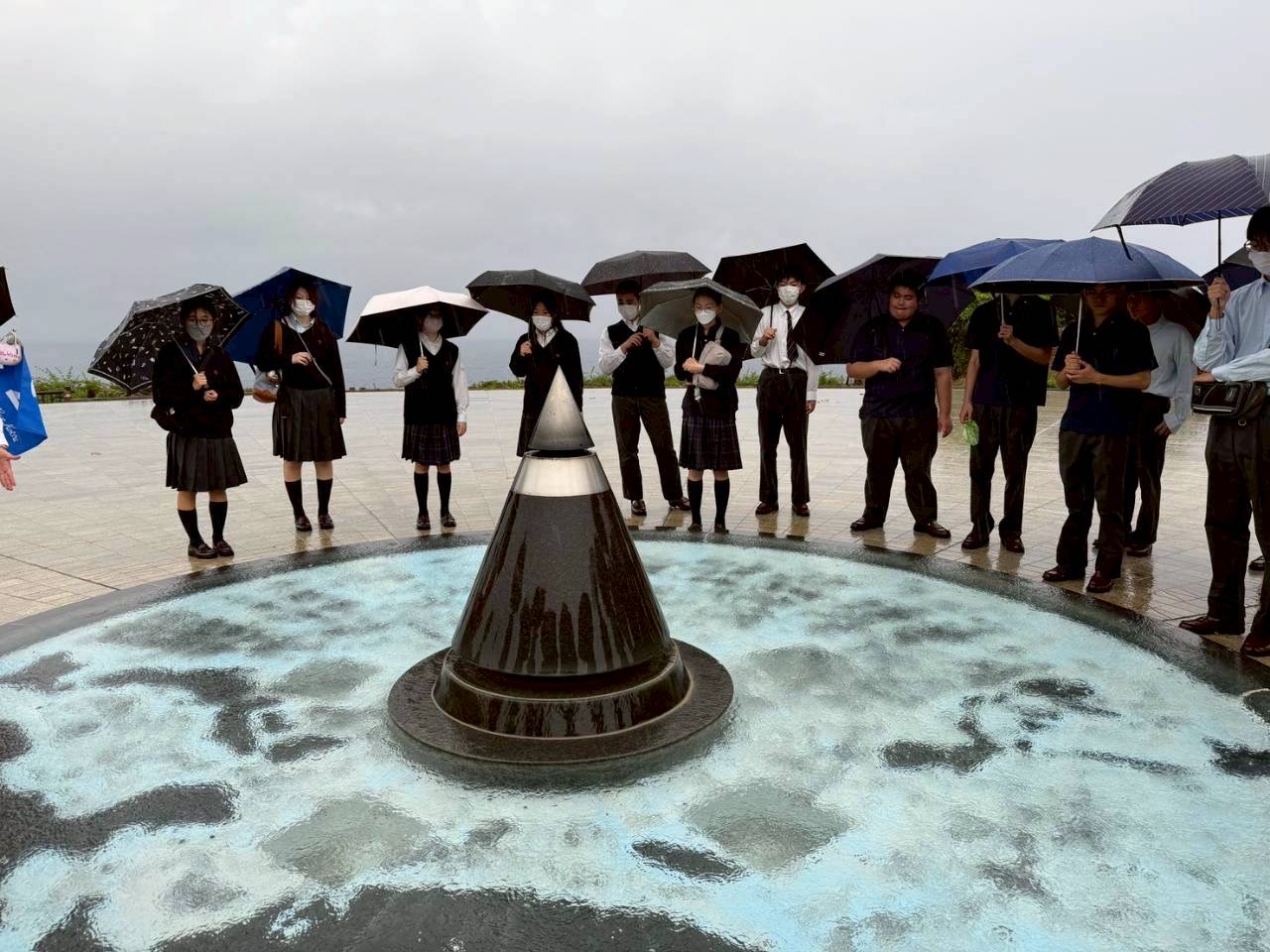 その後、降りしきる雨の中、ひめゆりの塔と平和の礎にて、当時の状況に思いをはせました。