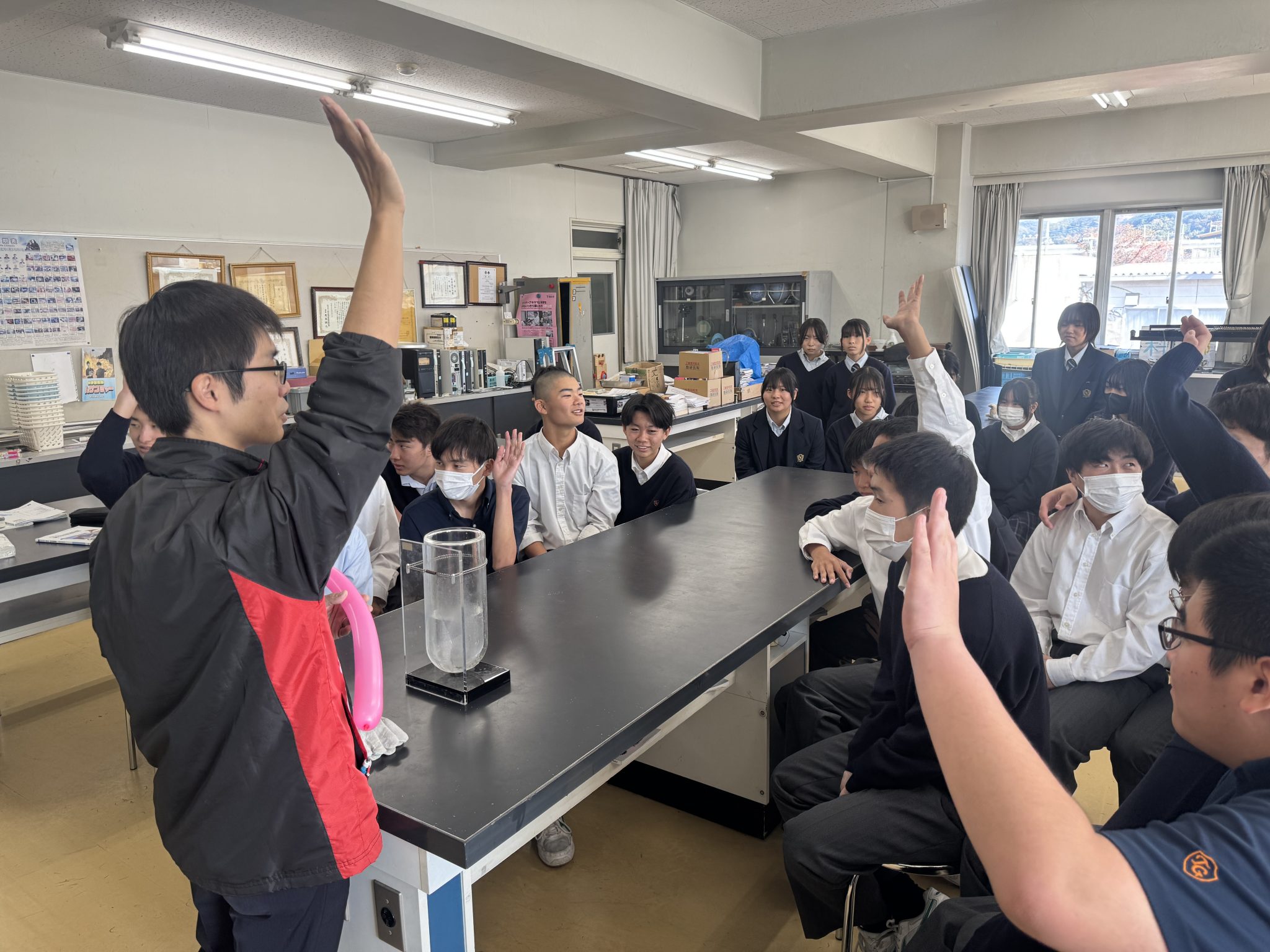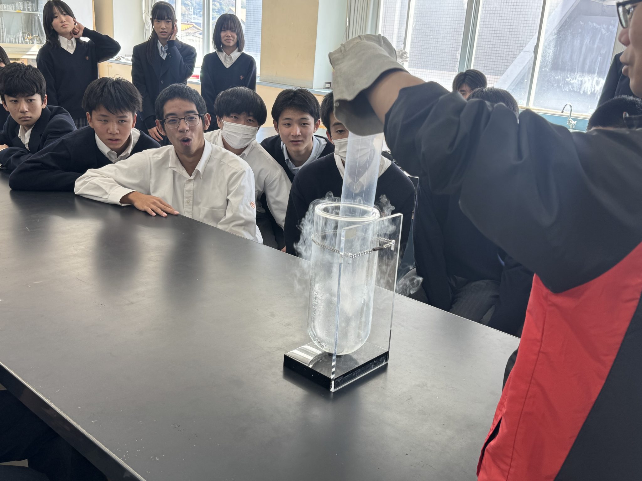 最初は液体窒素に関する性質や諸注意を行い、極低温状態の物質を扱う危険性に生徒たちはかなり驚いていました。