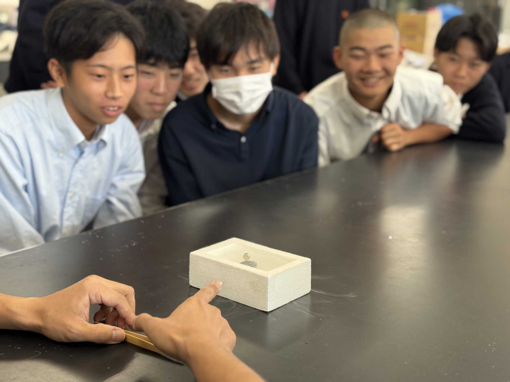 その後、さまざまな物質を冷却するたびに、「おぉ~」「えぇ~」などと声をあげ、最後の超電導物質の冷却実験では、イリュージョンを見ているかのように目を輝かせていました。