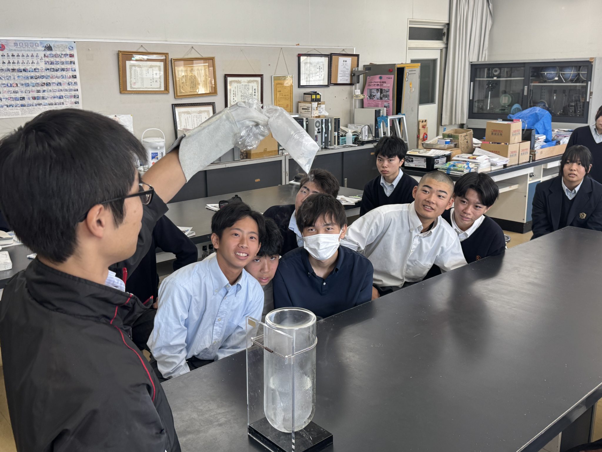 熱エネルギーが奪われていくことにより、それぞれの物質がどのように状態を変えていくのかについて、演示実験を行いました。