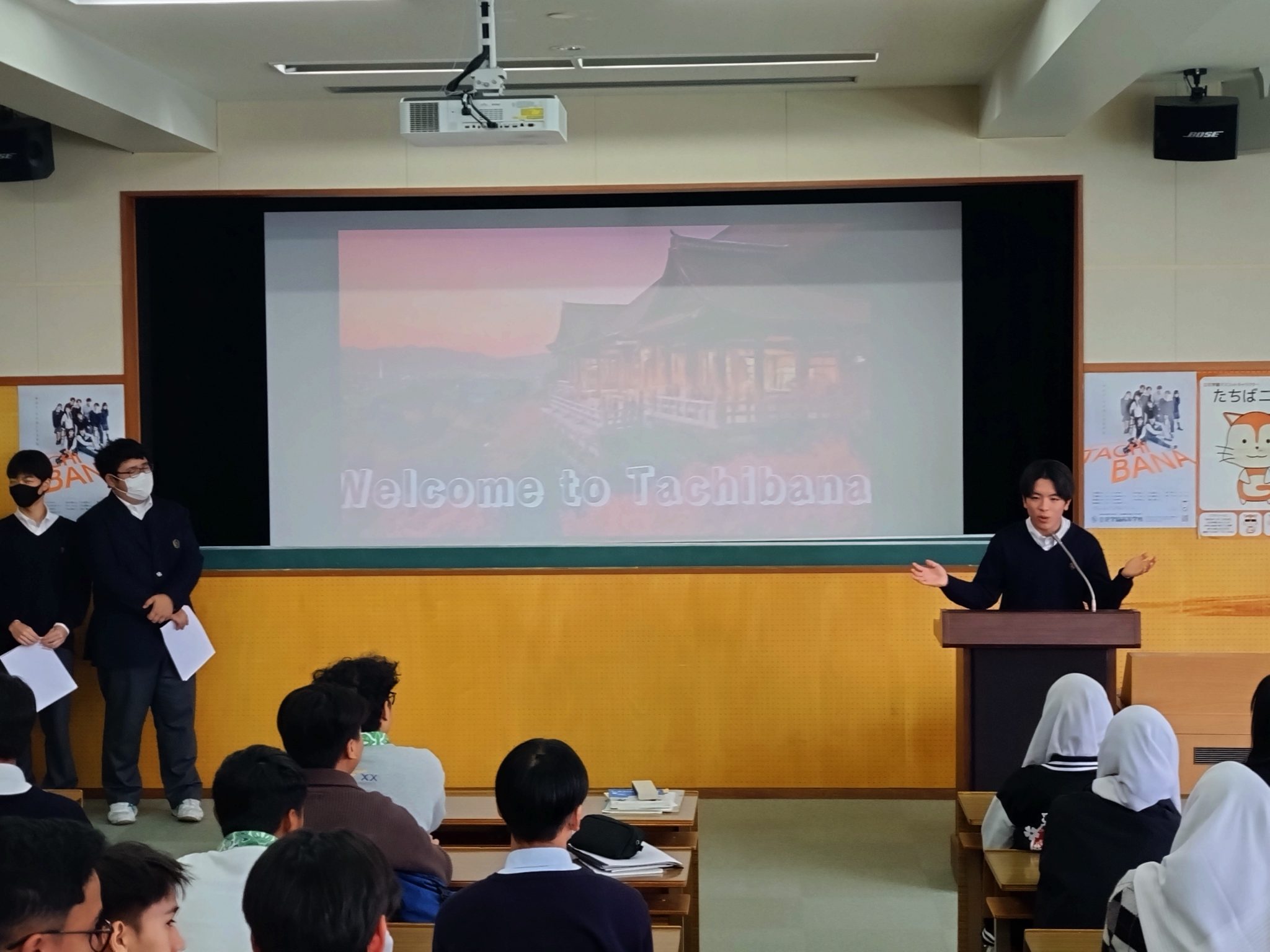 10:30頃に本校に到着し、ウェルカムセレモニーを行い、本校生徒が日本と本校に関する紹介をスライドを使って英語で行いました。