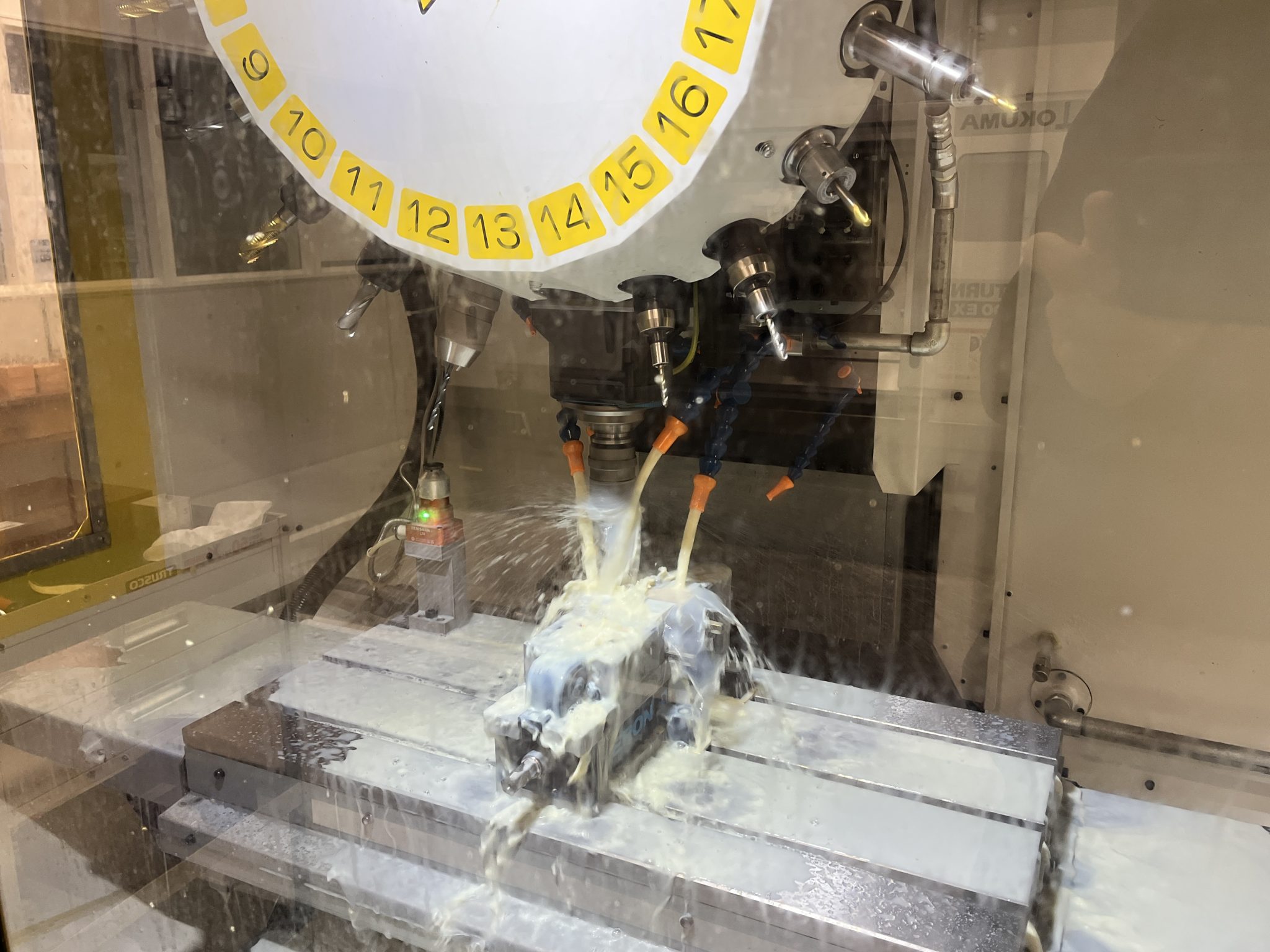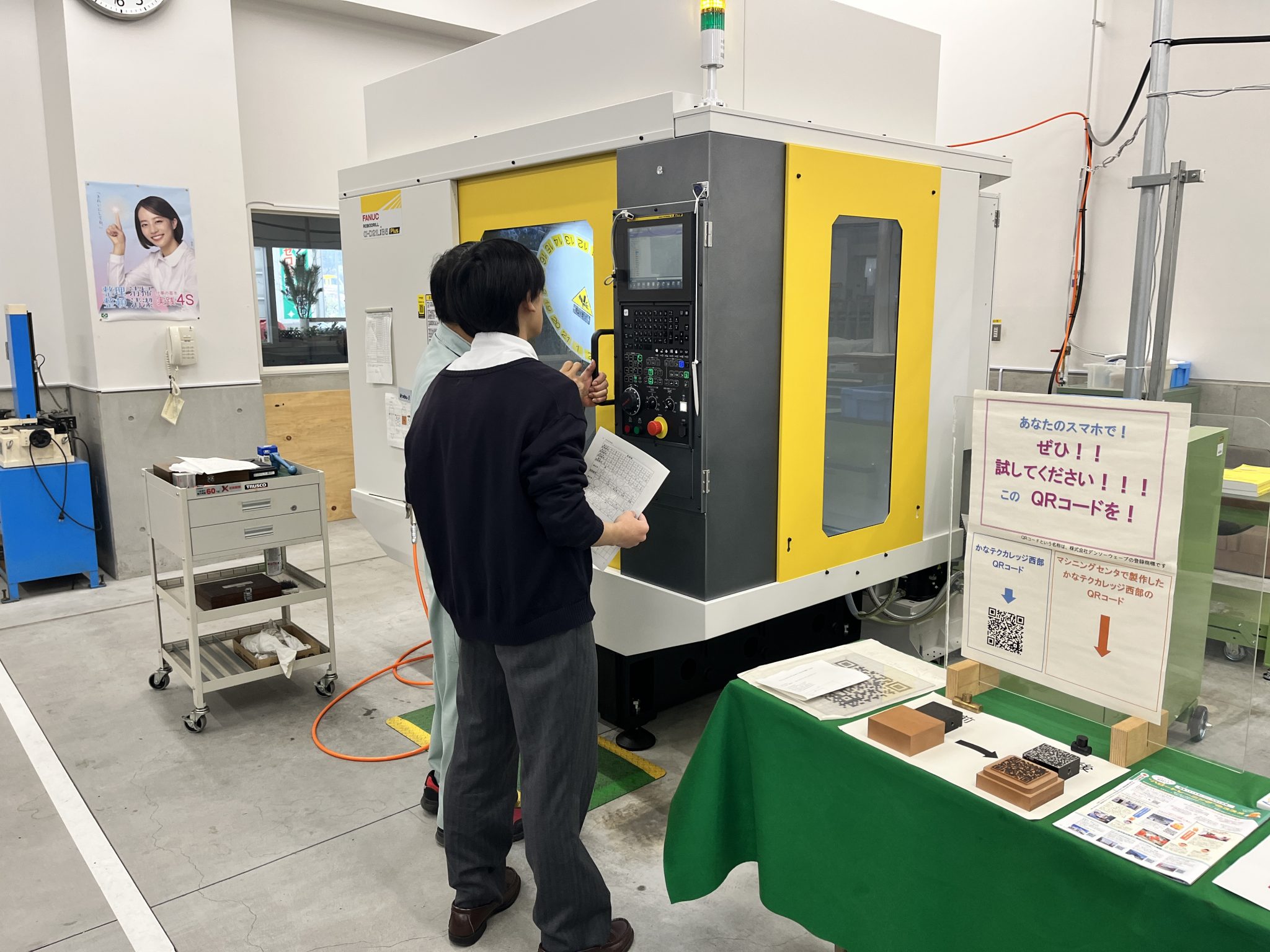 その後、生徒たちはCAD体験に参加しました。CADとは、コンピュータを使って設計や製図を行う技術で、製品づくりの現場で幅広く活用されています。今回は、キーホルダーの制作に挑戦しました。生徒たちは自らデザインしたデータを機械に入力し、プログラム通りに機械が動いて製品が完成していく様子を間近で見学しました。
