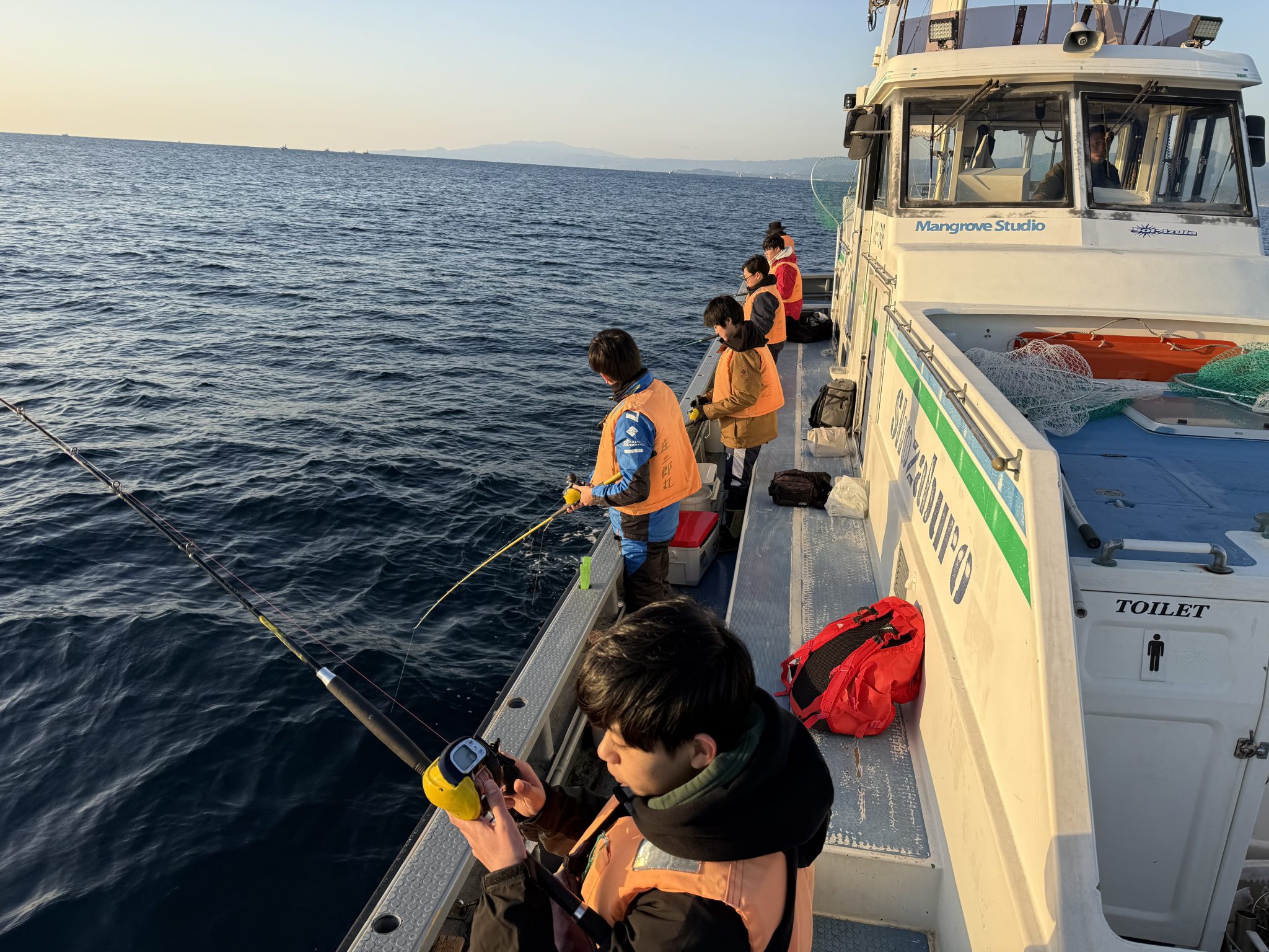 毎回お世話になっている、平塚の庄三郎丸さんの船を仕立てて、部員13名で行ってきました。初めてアマダイ釣りをする部員もおり、出船前には釣り方のレクチャーをしていただきました。