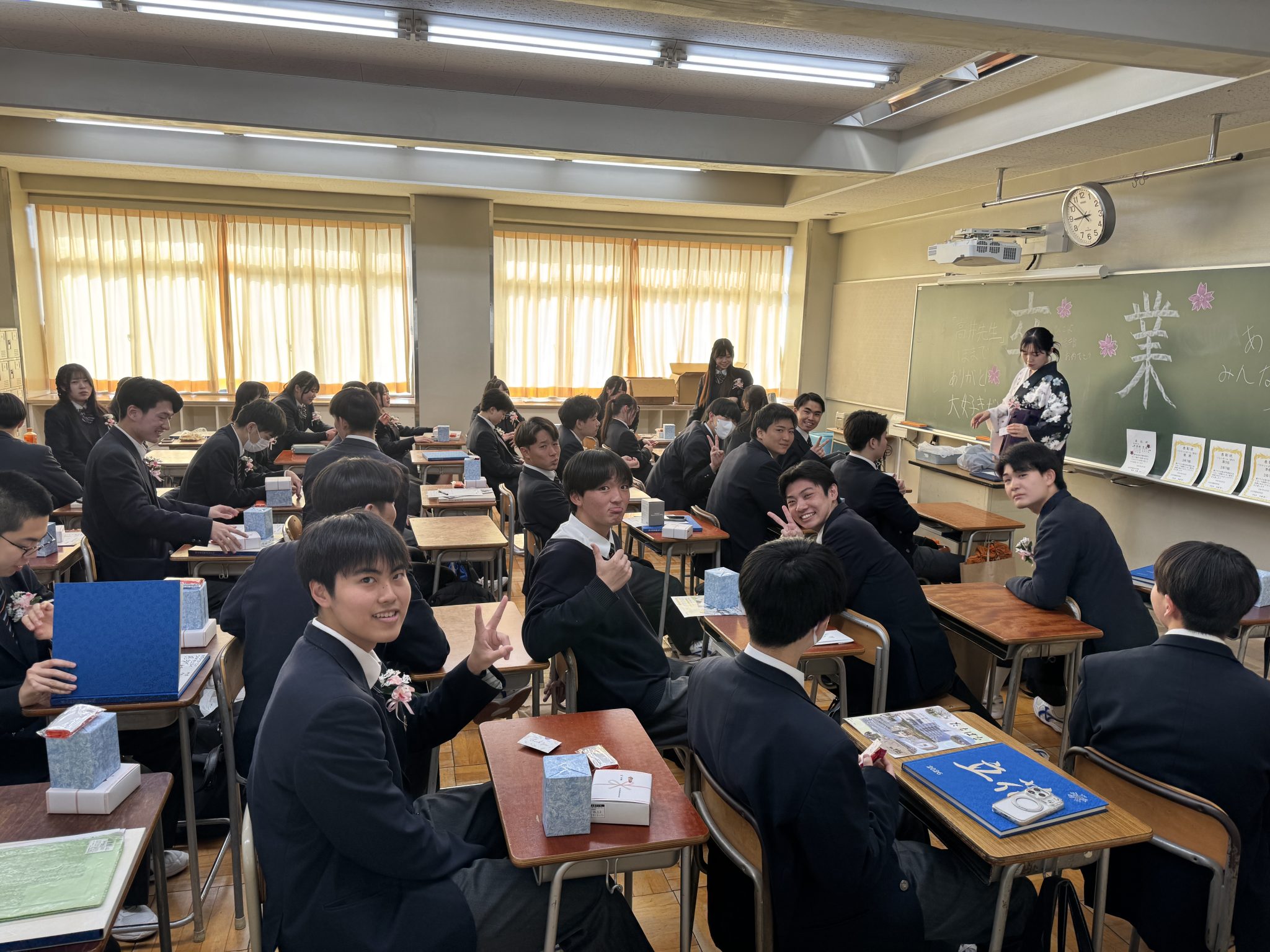 式後の教室では、友人同士で語り合い、色紙に寄せ書きを書き合いながら、最後のひとときを大切に過ごす姿が見られました。