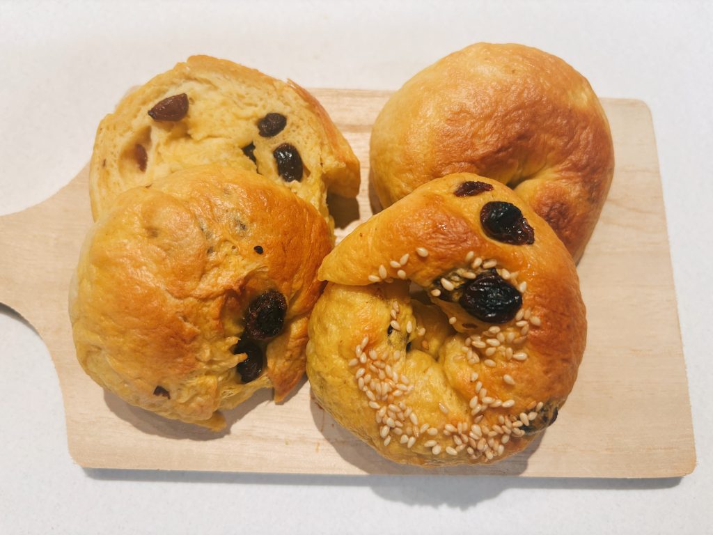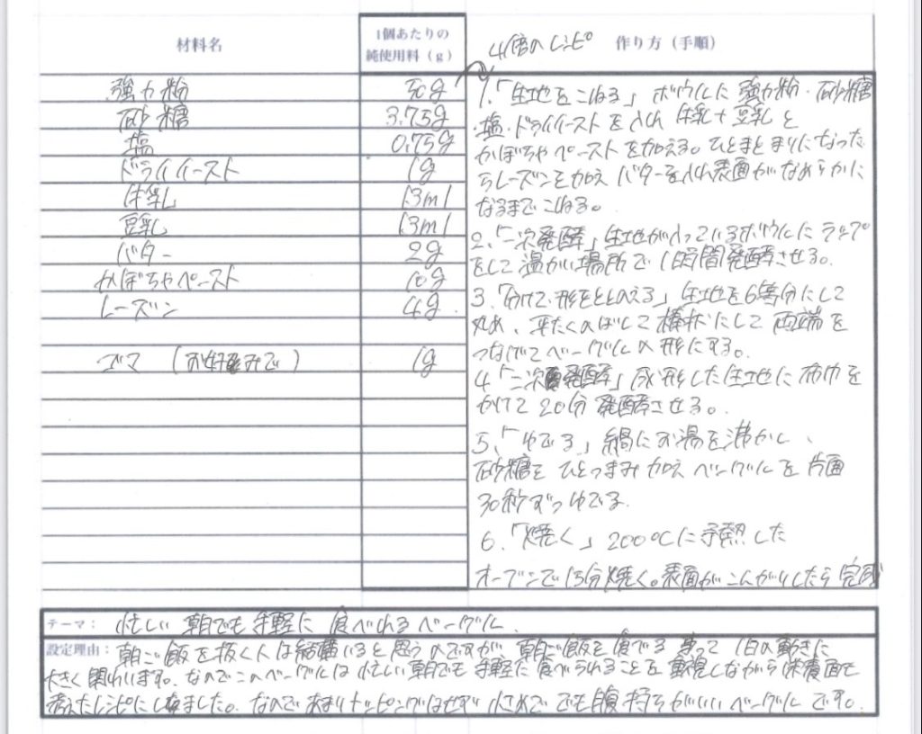 私は「忙しい朝でも手軽に食べれるパン」をテーマにレシピを考案しました。このテーマにした理由は、現代社会に生きる人は忙しく、朝ごはんを食べる時間さえとれない人も多くいると思ったからです。忙しい中でも、朝ごはんは一日の動きに大きく関わるエネルギーを取る時間だと思い、少しでもエネルギーを補完できるよう、あまりトッピングなどはせず、手軽に、簡単に栄養は取れるということを意識しました。