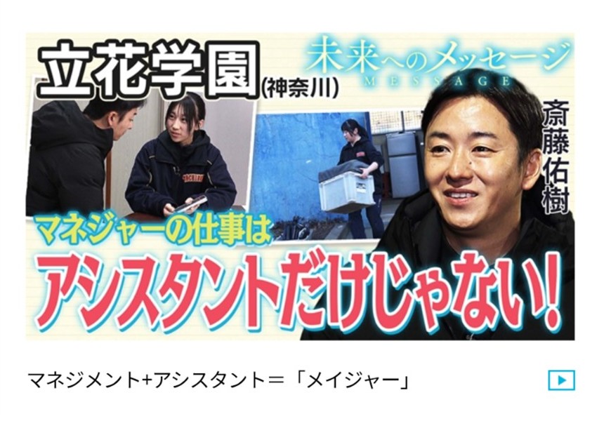 本校野球部マネジャーの日々の活動が、斎藤佑樹さんがフィールドディレクターを務める「バーチャル高校野球」内の企画『未来へのメッセージ』に取り上げられました。 野球部マネジャーは、ジャグ作りや洗濯といった選手のサポート業務に...