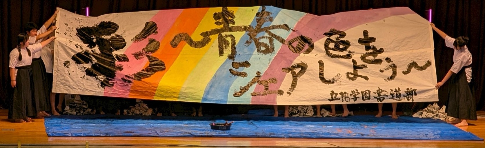 吹奏楽部の演奏、チアリーディング部の演技後、会場内で「虹」を合唱中に、書道部がスローガンの垂れ幕を制作しました。